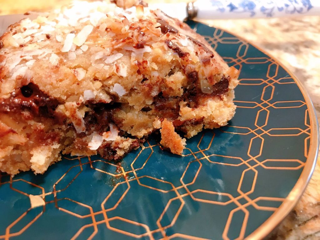 It’s made with a no refined sugar blend of organic coconut sugar and allulose for reduced overall sugar, Lily’s no sugar added dark chocolate, and is mostly/almost paleo (aside from the sugar in the caramel and coconut, and the gentle use of rice flour!).