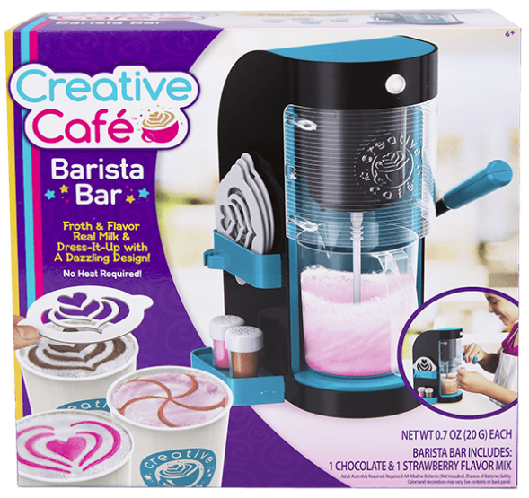 With the Creative Café Barista Bar you can be a future barista! Create endless latte looks with just milk. Make yummy chocolate or strawberry drinks with real foamy froth on top.