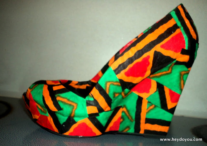 So I took to a simple pair of black wedges, cut up some spare fabric, and got to glueing! I have to admit, I was worried that I’d make a total mess, ruin my shoes, and waste my fabric, but it turned out pretty good. I love that WeldBond dries clear, and the best part about it (apart from it’s glueing capabilities lol), it’s non-toxic, so I didn’t have to worry about getting dizzy from the fumes that most glues have.