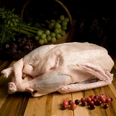 Cooking Tips: When prepping a goose, trim the excess fat from the neck and cavity. That fat may be rendered and made into cracklings or used to cook with. Prick the skin all over to allow fat to escape while cooking and carefully remove rendered fat with a baster or large spoon about every 30 minutes. As with most poultry, when roasting a whole goose, the breast may be done first and can dry out while the legs are finishing. You can remove the breast and keep it tented with aluminum foil while continuing to cook the legs, basting often to keep them moist. Goose is cooked when the meat measures 165 – 170 degrees F on an instant-read thermometer and the breast juices run pale pink when pricked. As a rule of thumb, calculate between 13 and 15 minutes per pound unstuffed, and 18 to 22 minutes per pound stuffed. When the goose is done, remove it from the oven and let it rest for at least 20 to 25 minutes before carving.