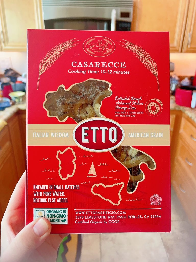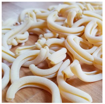 Casarecce means “homemade” in Italian. It was a relatively easy pasta shape to make in the home. The slightly twisted S shaped pasta is great for fresh, chunky sauces.