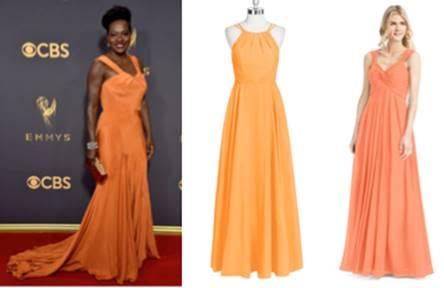 Orange is the New Black – Color dresses were abundant at the award show and Viola Davis is always one to embrace a bold hue. Tonight was no exception, as she wore a bright orange Zac Posen gown with thick straps and front detailing. Azazie carries several similar styles that offer a ton of bang for your buck. The floor-length Melinda dress (shown in Tangerine; $129) features spaghetti straps leading up to a halter neckline, pleating throughout the top of the bodice and pockets to stash some money and your favorite shade of lip-gloss. Kaitlynn (shown in papaya; $119) is a floor-length, empire style dress with a heavily pleated bodice that is sure to flatter any figure.