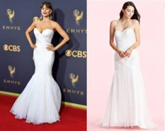 Wonderful in White – With summer wedding season barely in the rearview mirror, many celebrities – such as Millie Bobby Brown (Stranger Things), Uzo Aduba (Orange is the New Black) and Evan Rachel Wood (Westworld) – opted to wear white for television’s big night. Trying to extend her newlywed status a little longer, Sofia Vergara joined the club, donning a beautiful strapless white Marx Zunino mermaid gown that showed off her amazing figure. For a similarly stunning look, Azazie’s Misty ($249) gown is a flattering sweetheart tulle strapless gown with a full pleated bodice and corset back that is sure to fit you like a glove, without breaking the bank.