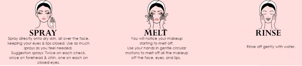 You can just spray directly onto dry skin. For eyes makeup removal: apply to closed eyes. Use dry hands in circular motions. Rinse with water. It is good for all skin types – Normal, Dry, Combination, and Oily. And it is Liquid Oil-Free.