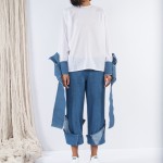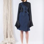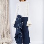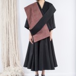 Vegan leather is introduced in tops, culottes, skirts and appliques on cotton pullovers. novelty yarns, cashmere wools and layered sheer fabrics enhance the collection. Denim continues to play an important role in knotting details, yarn sleeved jackets and bandeau tops. leather accessories are re-introduced in the fall/winter 2016 collection with clutches and multi-purpose arm bands.Rubin Singer