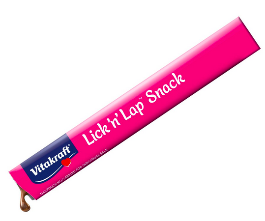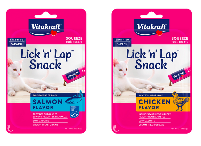 - Lick ‘n’ Lap Snacks: Vitakraft’s #1 most popular cat treat – a smooth and creamy lickable treat in a single-serve packet. Squeeze out the product at your desired pace and allow your cat to lick it from the packet, or off your finger or a plate. Two flavors: Chicken and Salmon