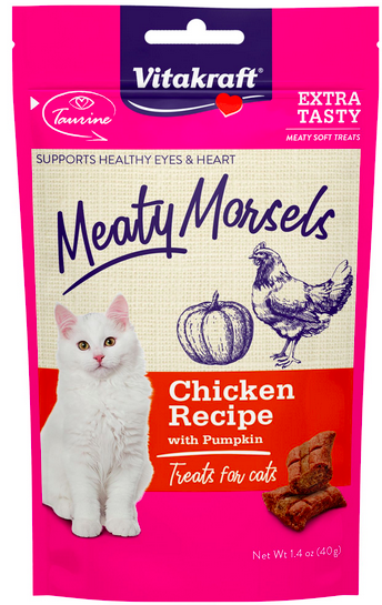- Meaty Morsels: the only cat treat of their kind on the market – a moist and tender, bite-sized treat made of 70% meat, with a high-protein chicken base formula, two meaty layers, and a tender center, which can also be used as a pill pocket. Two flavors: Chicken Recipe with Pumpkin and Chicken Recipe with Salmon.