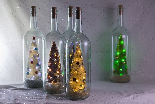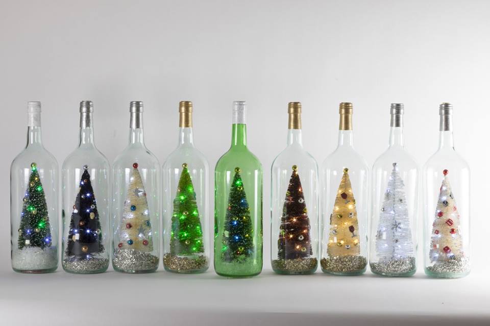 Fully Dressed and Lit Tiny Christmas Trees Beam From Inside Upcycled Wine Magnums