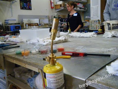 If you can’t handle the heat, stay outta the workshop!I went to my very first glass blowing class in Hollywood and made some fantastic glass globes aka Christmas ornaments! The instructor, Kathy Reimer has been doing this for over 10 years and loves glass as a medium for so many possibilities. If you are in LA and intersted in doing some ‘grounding exercises’ – I highly suggest this class! I signed up through the LA City College’s extension courses but I am sure you can sign up directly with Kathy too.