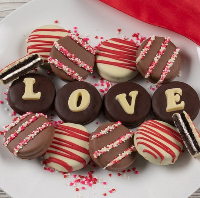 There is no better way to show your love than with these Belgian chocolate-dipped Oreo® Cookies. The sweetest ever assortment of Oreo® cookies that are drenched in delicious white, milk, and dark Belgian chocolates, then embellished with a sweet confectionary drizzle and red heart-shaped candies. You can’t think of a sweeter Valentine’s Day gift!