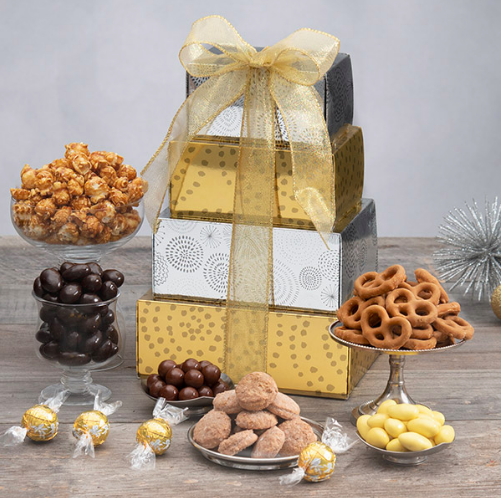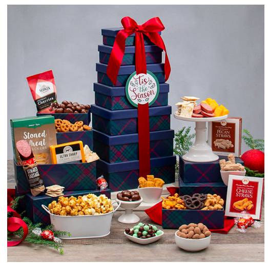 NEW FOR 2020Every year, GourmetGiftBaskets likes to create a bright new gift that gets people as excited about Christmas as everyone is! GourmetGiftBaskets created this gorgeous, and tall, navy, and red gift tower, that people all agreed was the beginning of a lovely arrangement! GourmetGiftBaskets’ team picked out their favorite winter treats like rich truffles and cookies, then the team added some more, and a little more, to create this beautiful gift that’s perfect for spreading holiday cheer!