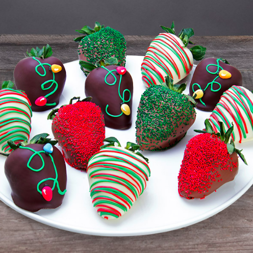 Christmas lights can give even the most patient person a headache. Luckily, when you cover them in chocolate it’s a different story! A dozen ripe, juicy strawberries are covered in milk, white, and dark Belgian chocolate and then decorated with festive drizzles and candies that look just like the lights on their tree. Delight them this Christmas with this delicious gift!