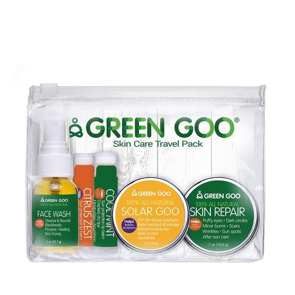 Looking for that healthy glow on the go? Pack Green Goo’s Skin Care Travel Pack in your suitcase to keep your skin silky smooth during any adventure. Discover what’s in this set:- Nourishing Lip Balms: Pucker up and protect those lips with 100% natural, herbal-based lip balms that nourish with intense moisture to relieve dryness year round. Soothe dry skin and create lush, hydrated lips with a high concentration of Calendula Flowers infused in specific organic oils that emulate the body’s natural chemistry. Formulated with Coconut Oil for natural sun protection, these beneficial lip balms heal your lips while achieving a soft and smooth look over and over again!