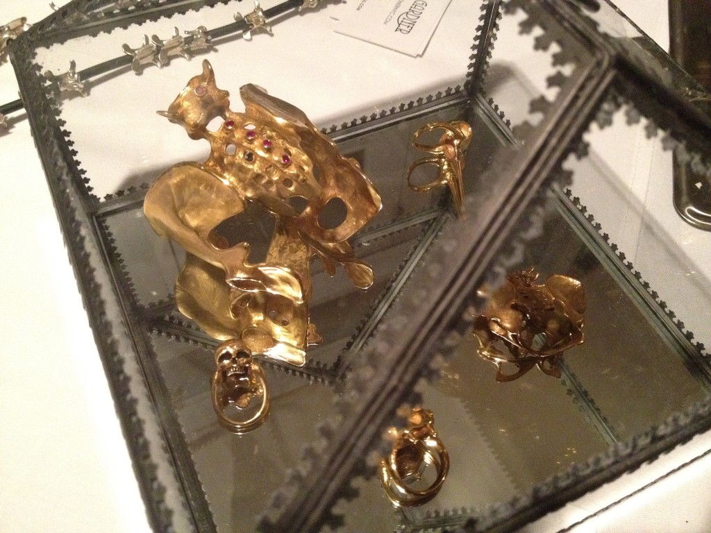 The pieces were detailed, brass and silver creatures and skulls from a high-fashion nightmare. Stones shimmered from their eye sockets, or in some cases they had empty gazes.