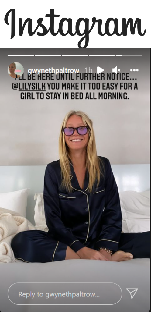 Gwyneth Paltrow, Academy Award winning Actress and founder of wellness brand Goop, looked stunning wearing LILYSILK 22MM Gold Piping Silk Pajamas Set in Navy in a story she posted on Instagram yesterday. Noting she’s a fan of the brand, Gwyneth looked radiant and relaxed in the 100% 6A grade mulberry silk, which is exceptionally soft against the skin and is currently available for purchase on https://www.lilysilk.com.There are some similar styles that you can find on Amazon.com.