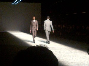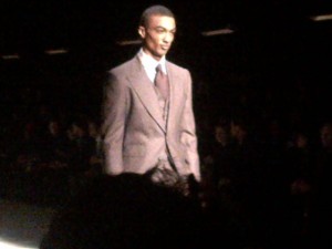 Back after a seven-year absence, all American designer Joseph Abboud showcased his Fall/Winter 2012 Collection of perfectly tailored and sophisticated Menswear at The Marine & Aviation Terminal, Pier 57. With the spotlight on Bernardo Rojo, the creative brains behind the operation, the crowd couldn’t have been more pleased. The color scheme was generally neutral—mostly grey and beige tones with maroon occasionally.