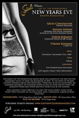 Ring in New Years with us!Win a date with Julian Carrington (UCC, UofT Law) smart, charming, sharp dresser&Me! Yvonne Kai (Havergal, UWO, FiDM) lipgloss junkie, clever, cute, connected…We want you to come with us this new years eve to the ultimate open bar party at the Burroughes (Queen & Bathurst)! Look how much fun they had last year.If you promise to be fun, dress amazingly, dance drunk and take lots of pictures, you can win!Just leave us a comment on why we should take you. Prize = 2 $100 tickets for the event. Winners will be announced on Dec 28th. Good luck!We are holding a New Years Eve event hosted by Greta Constantine, Shinan Govani, Todor Kobakov (who fashion just profiled) as well as Tyrone Edwards (1LoveTO) at the Burroughes building!We are taking over the first, third, sixth and rooftop of The Burroughes Building for the party. The idea of the party is to model the composition of guests after Truman Capote’s infamous black and white ball held at the Plaza, “the party of the century” where the focus of the party was on the people and bringing together dynamic people from across all industries to create a memorable event. Our goal is to bring back the glamour of the past through the theme of modern masquerade (we will provide lots of masks). At Truman’s ball, “there were no oversized centrepieces, no trellises, no blooming bowers or standard sights as seen at every society party. At Truman’s ball the gorgeous swans and all the other beautiful people would be the flowers.”