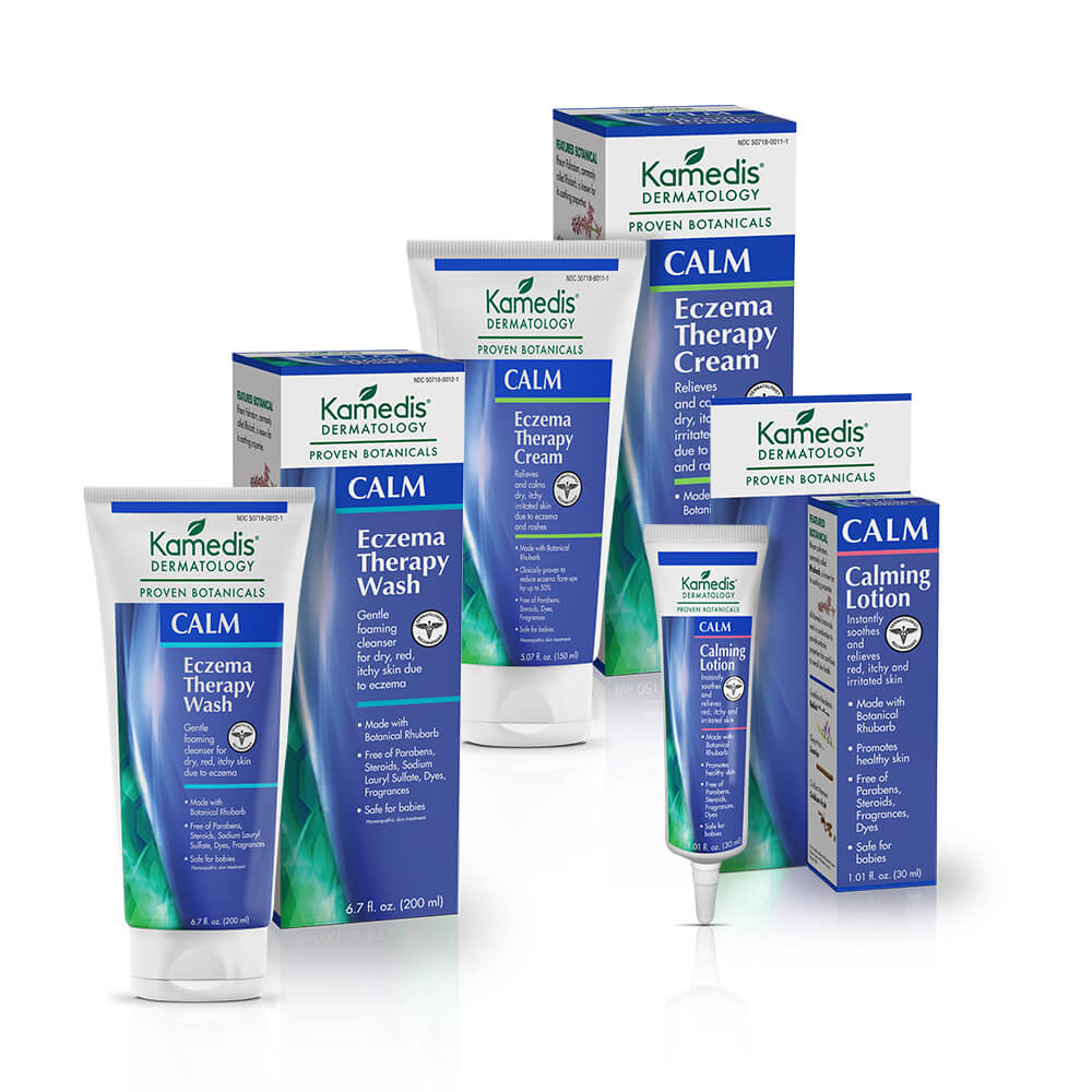 - KAMEDIS CALM Eczema Therapy Cream and Eczema Therapy Wash, a botanical rhubarb-based treatment for eczema including the extremely dry, irritated, itchy and/or red skin characteristic of atopic dermatitis. CALM Eczema Therapy Cream (MSRP $19.99) has been clinically proven to reduce flare-ups by 50% in two weeks and can be used on both the body and face, wrapping the skin in a protective layer that provides long-term relief. CALM Eczema Therapy Wash (MSRP $11.99) is a rich foaming gel that both cleanses and calms affected skin. A companion Calming Lotion (MSRP $9.99) soothes and moisturizes. For adults, children and babies as young as 6 months. No steroids, fragrance, parabens or dyes.