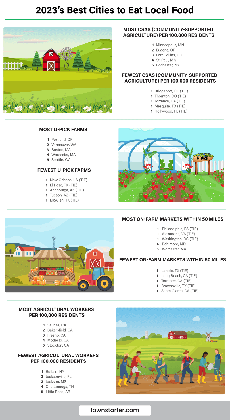 LawnStarter looked for cities with great access to community-supported agriculture (CSAs), u-pick farms, local dairy farms, and on-farm markets. LawnStarter also considered the number of local food movement groups, among 17 metrics. Dig into our ranking below. To learn how LawnStarter ranked the cities, see our methodology.