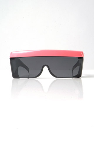 1> 1980s vintage sunglasses with smoke lenses and neon pink bar across top! Ultra wide temple for maximum drama that tapers to ear.