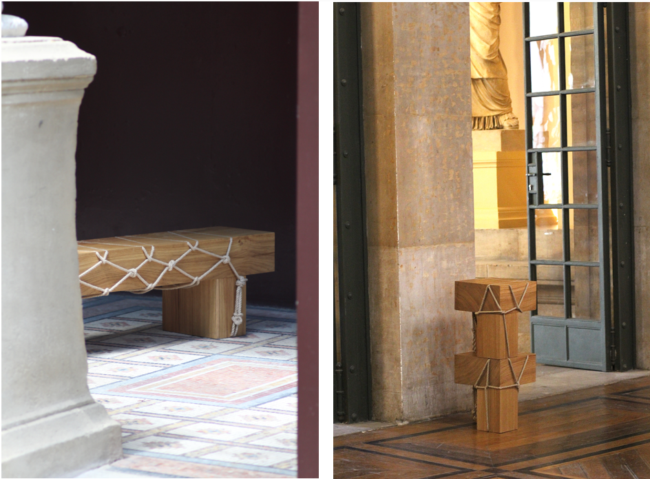 In a minimalist spirit, bridging art and design, the artist has created benches and stools (“Shibari Bench” and “Shibari Stool”) inspired by her residency in Kyoto. Massive oak beams from Burgundy (over 100 years old) are encased in skillfully knotted linen ropes; the wood, notched on the surface, almost closes around the rope. As always for the artist, it’s about achieving great simplicity in form without hiding how things are made, showing how materials come together.