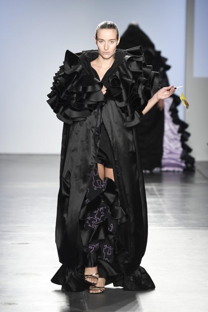 Experiments with volume are revealedthrough oversized hoods and layers of ruffles.