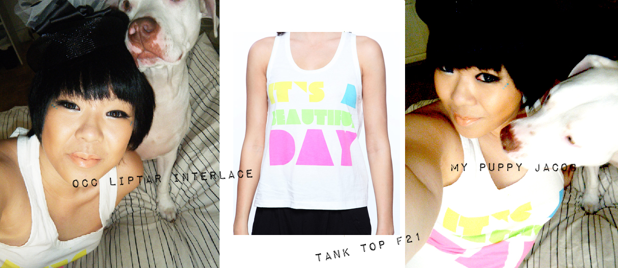 Analog (Chocolate color) and Tone (Pinkish Vanilla) makes me think of desserts, milkshakes and ice cream cones. This summer is going to be so sexy! Two-tone lips, twist cones and maybe a mixed boyfriend on the side.Interlace is the color of pure love. My tanktop says it all. It’s a beautiful day. Jacob loves peach colored kisses all day.