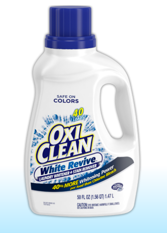 Bring back brilliant whites with OxiClean™ White Revive™ Laundry Whitener + Stain Remover Liquid. This laundry whitener works with your laundry detergent to whiten white clothes 40% better than chlorine bleach with no chlorine smell and it’s safe on colors. Now you can maintain and revive your dingy white clothes and help keep them looking like new longer with OxiClean™ White Revive™ Laundry Whitener + Stain Remover Liquid.