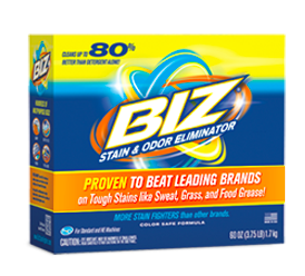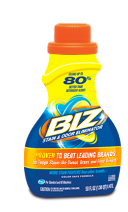 Pre-treat stains directly with BIZ® liquid by wetting the area with warm water and applying Biz. Rub gently and wait 5-10 minutes then wash as usual. Or, add Biz to every load to boost the power of your detergent.