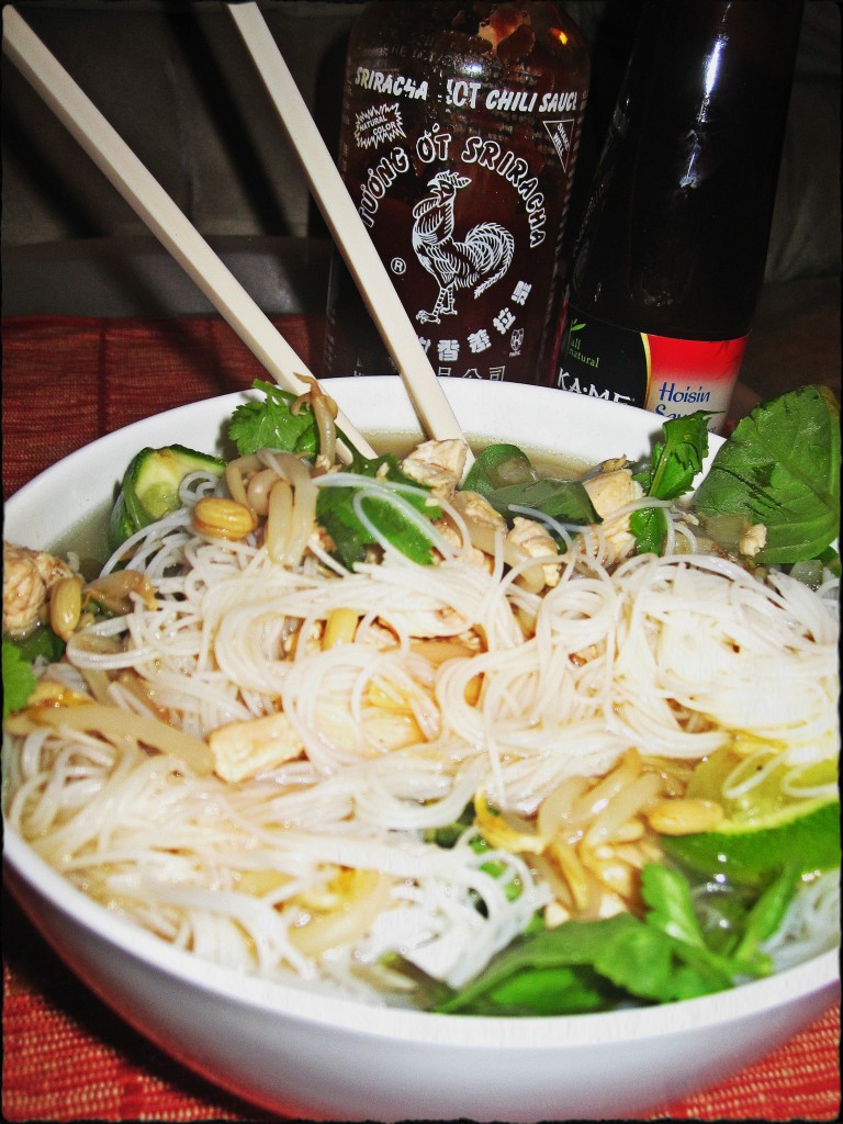 In case you don’t know pho (pronounced “fuh”), it’s a popular Vietnamese soup with an aromatic broth that involves an 8-10 hour cooking process! It’s usually served with beef or chicken over rice noodles. Various toppings can be added based on your tastes, including mint, cilantro, basil, lime, bean sprouts, chilies, green onions and hoison sauce.
