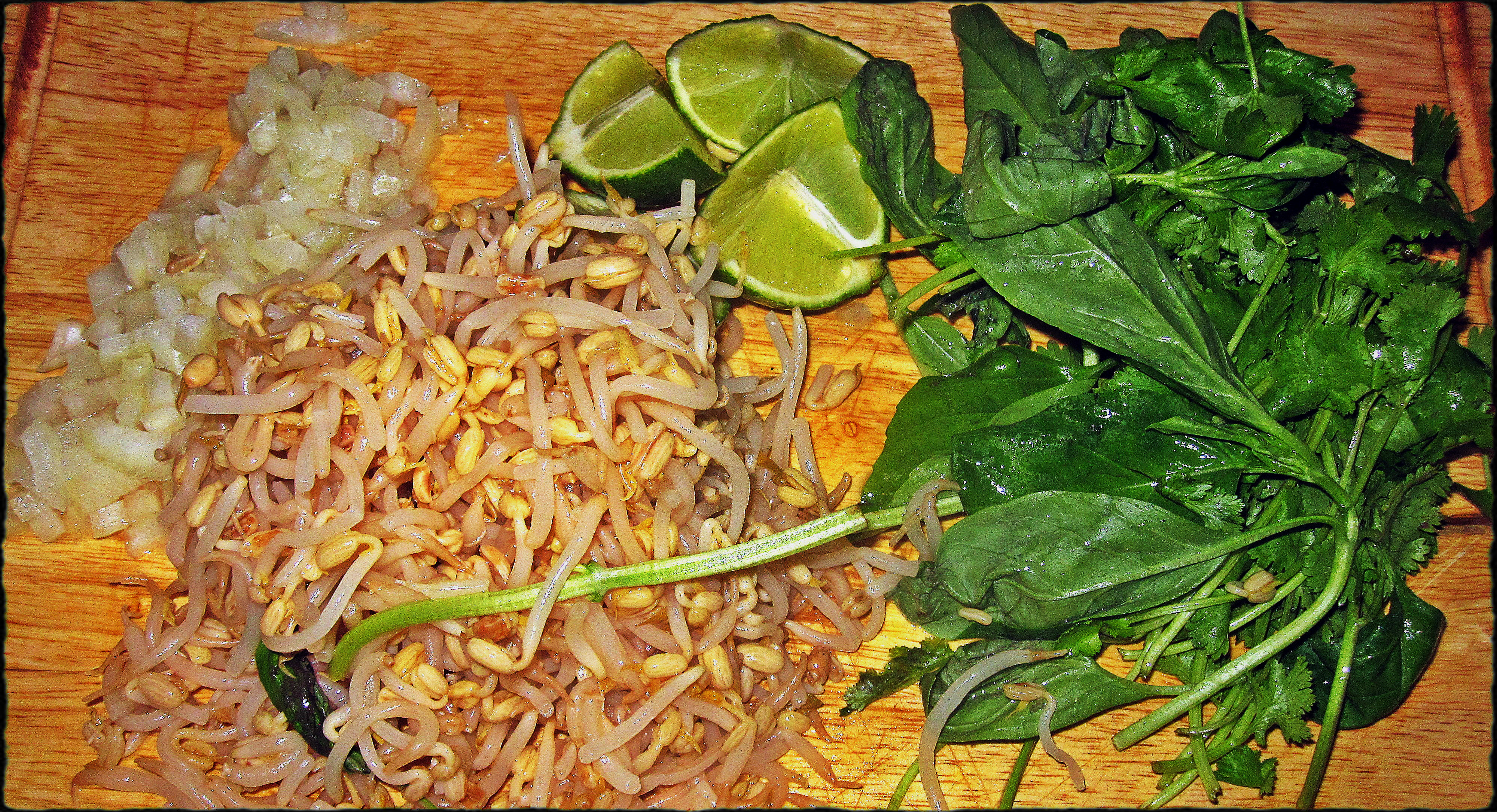 Step 3: Chop some onion (I didn’t have green onion, so I used a Vidalia onion), lime, and wash bean sprouts, cilantro and basil