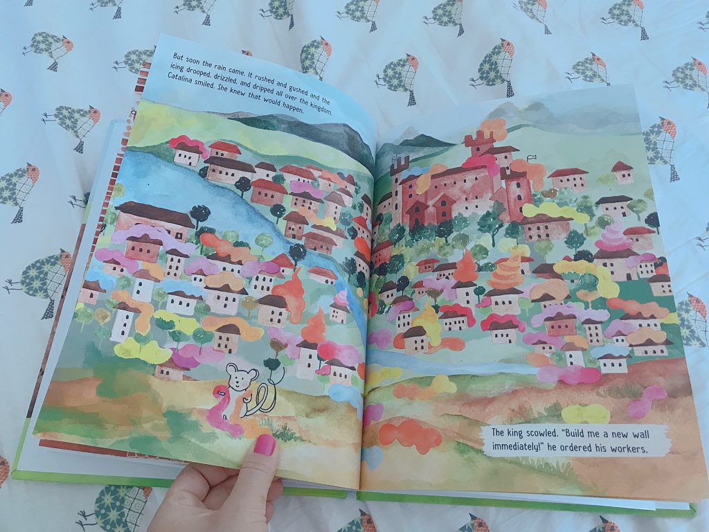 Catalina and the King’s Wall follows Catalina, a brilliant and busy baker who works for a tyrant king. When Catalina hears of the King’s plans to build a wall around the kingdom to keep the neighboring village out, she fears her family won’t ever be able to visit her again. Catalina tries to trick the King into building a wall that won’t stand up to the wind or rain – but he keeps demanding something more and more impenetrable. In the end, her cookie dough wall does remains steadfast in the face of a fierce storm, much to Catalina’s chagrin. At the last minute, she tricks the King into giving into his gluttonous ways, as he eats the entire wall, and Catalina is once again reunited with her family.