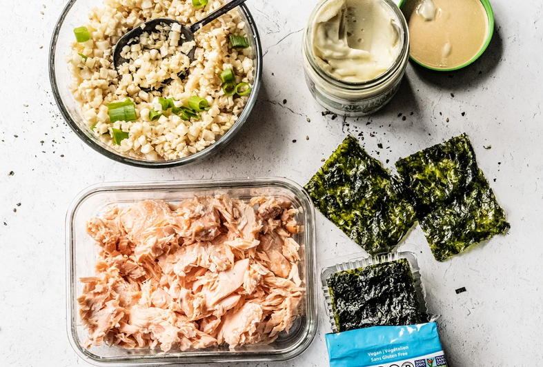 - Place the seaweed in the palm of your hand, shiny side down, and add a thin layer of cauliflower rice on the left third of the nori sheet. Place fillings—salmon, mayo, sesame seeds—vertically across the middle of the rice.