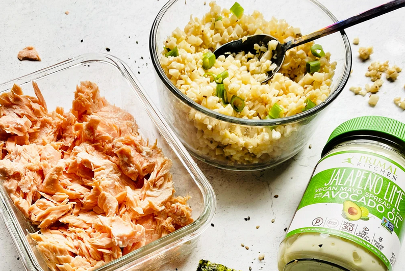Making keto sushi and keto hand rolls at home can be the best option because you can control the ingredients used. Experiment with sushi-grade tuna, other high-quality raw fish, or use pole-caught canned salmon or tuna to keep things super simple. Use keto-friendly condiments like Primal Kitchen’s Keto Certified mayos made with avocado oil or Primal Kitchen’s Keto Certified Buffalo Sauce if you want an extra spicy kick.