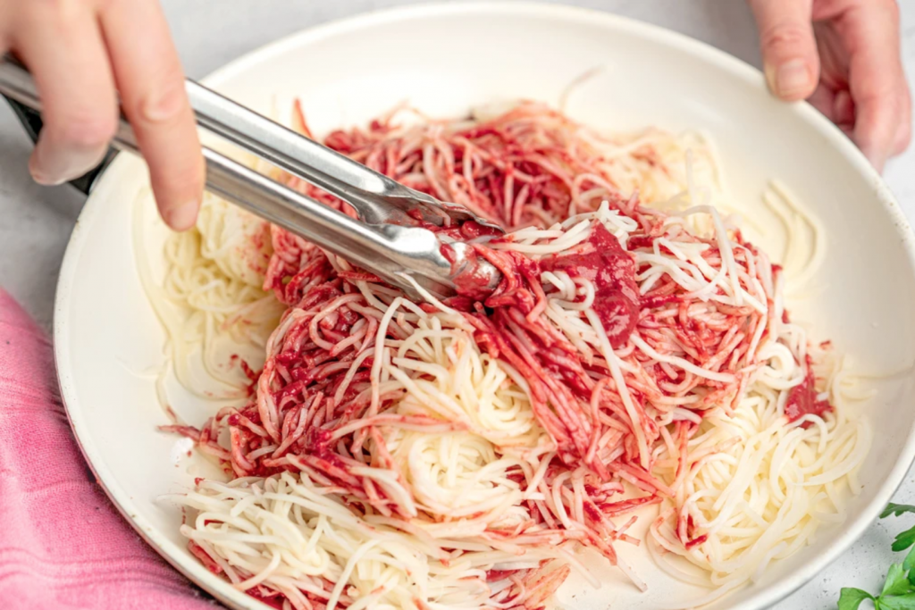 The recipe paired the swirly hearts of palm noodles with Primal Kitchen vegan Pink Primavera Sauce, which is made with avocado oil; beets, tomatoes, apples to get a gorgeous fuchsia hue; and cashew butter for creaminess with no dairy. This four-ingredient keto vegan spaghetti is the perfect pantry dish to throw together in less than 10 minutes.