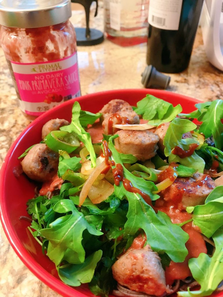 I used Organic Black Bean Spaghetti, Polish Sausages and Primal Kitchen’s No-Dairy Pink Primavera Sauce with a sprinkle of arugula leaves and sriracha sauce on the top. Ryan was super happy with that. Of course I felt happy too.