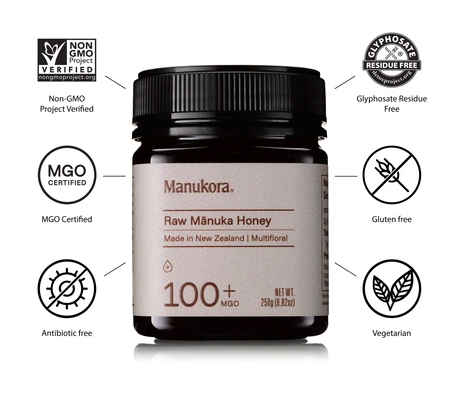 This raw Mānuka Honey from the remote New Zealand wilderness is a great place to start your Mānuka Honey journey. It has all the benefits of raw honey with the verified presence of at least 100mg/kg of methylglyoxal (MGO). The taste of this pure honey is deliciously rich and floral with a warming hint of spice. Manukora MGO 100+ is a perfect health booster to culinary creations; it’s perfect for toast, smoothies, warming up with a cup of tea or cooling down with ice-cold lemonade, and much more.