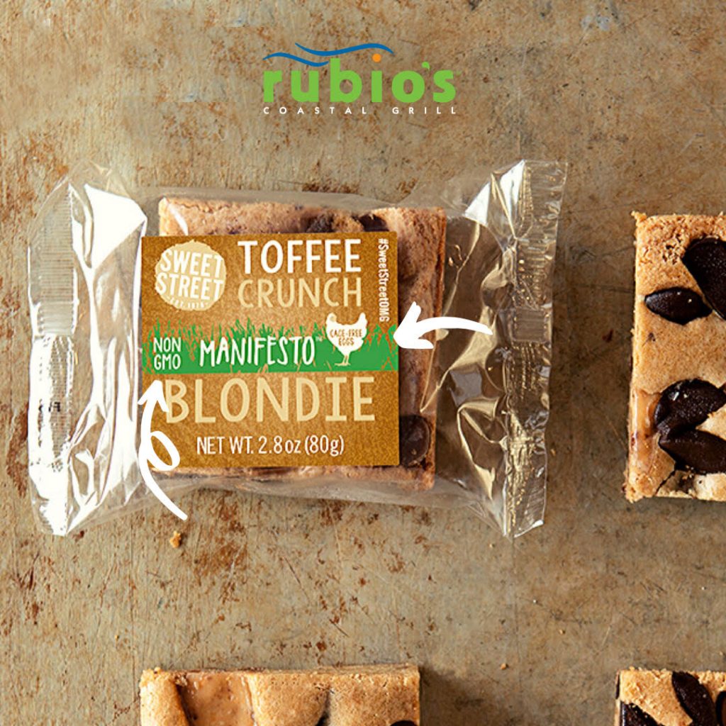 The Toffee Crunch Blondie and the gluten-free Honduran Chocolate Brownie, from Sweet Street Desserts, are new additions to the Rubio’s menu, and align with Rubio’s long-standing commitment to use the very best ingredients. The desserts feature clean ingredients including pure creamery butter, pure cane sugar, cage-free eggs, sustainable chocolate, and are free of additives and GMOs.