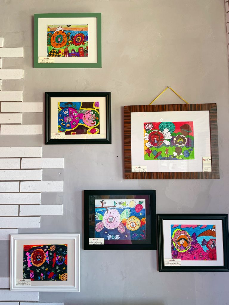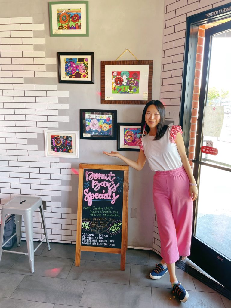 Please check out the Flying Donut Art Show at Donut Bar Pacific Beach. The beautiful and whimsical artworks are created by Lulu’s students from US Arts Education Center, which is a well established art school in San Diego. They are only 6-9 years old. These kids are talented little artists who love art, as well as delicious donuts!