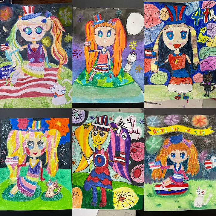 These artworks are made by Lulu’s students from US Arts Education Center in San Diego. These little artists from top left to bottom right are Bethica, Katie, Olivia, Julie, Ellen and Carol. They are only 5-8 years old. They are so talented and use their own way to celebrate 4th of July.