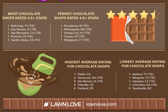 Chocolate is wonderful on its own, but this luxurious treat also has the superpower to enhance the flavor of other foods like strawberries, bacon, pretzels, and coffee. To mark International Chocolate Day on Sept. 13, Lawn Love ranked 190 of the biggest U.S. cities to determine the Best Cities for Chocolate Lovers.