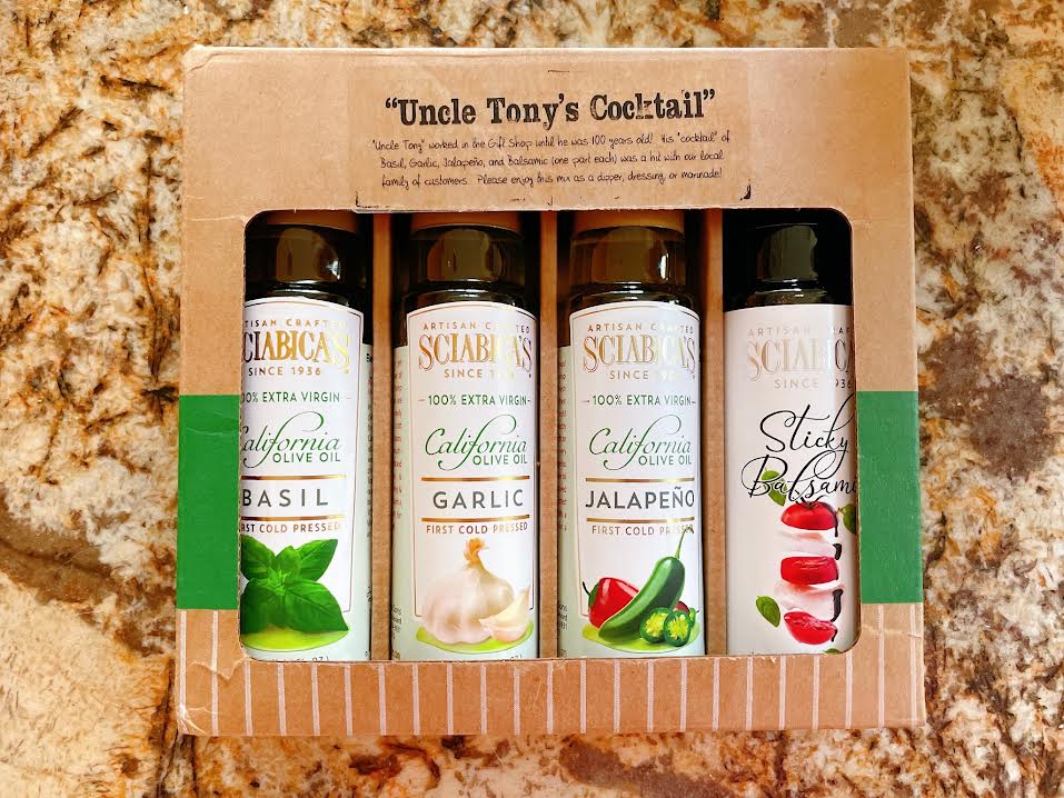 My choice for dad is “Uncle Tony’s Cocktail” pack, and now available in ‘mini’ size! ‘UNCLE TONY’ is a legend at Sciabica Company. He was actually the founder’s first-cousin, but all of the team members and customers called him “uncle”. At 100 years old, ‘Uncle Tony’ was selling in the Sciabica’s Gift Shop in Modesto pushing his own recipe for a fabulous olive oil & balsamic dressing, dubbed “Uncle Tony’s Cocktail”. Simply mix one Part each of Basil, Garlic, and Jalapeño olive oils with Sciabica’s new Sticky Balsamic for a savory & sweet flavor explosion. Perfect for salad dressing, bread dipping, and meat marinades.