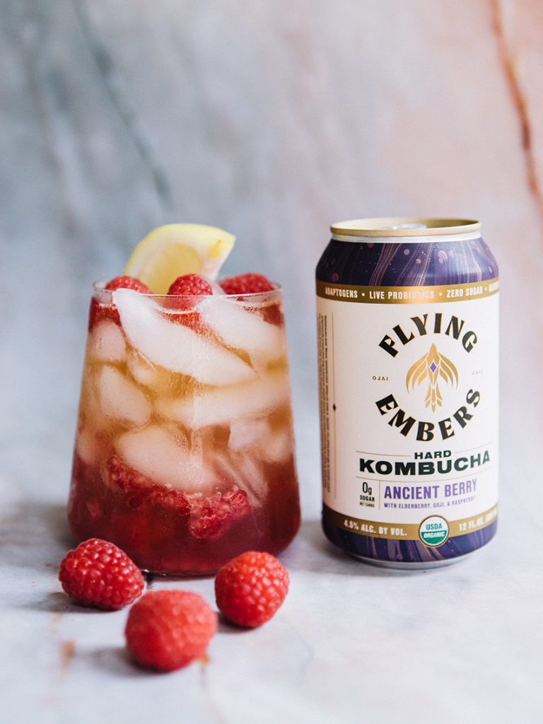 1.5 oz Bourbon/Rye .5 oz Lemon Juice .75 oz Simple Syrup 2 oz Ancient Berry Flying Embers Kombucha Raspberry/lemon garnish option Combine all ingredients in old fashion glass filled with ice. Float 2 oz Ancient Berry Kombucha on top. Garnish with lemon wedge and raspberries.