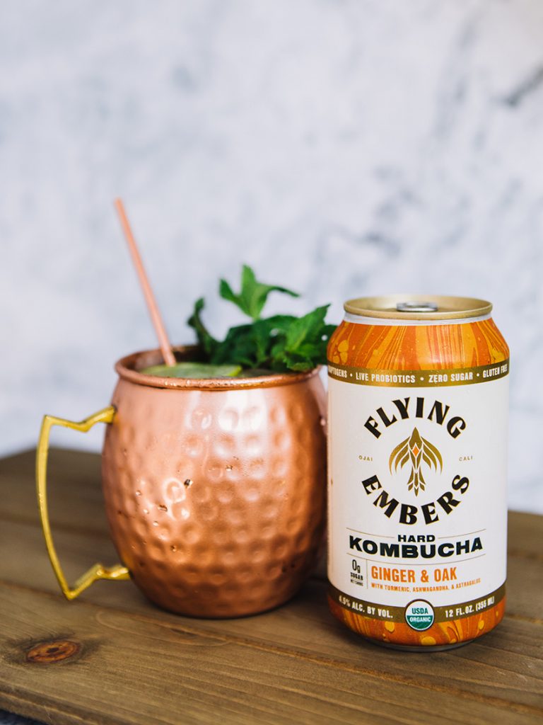 1.5 oz Vodka 2 dashes Angostura Bitters .5 oz Fresh Lime Juice & Lime Wheel Flying Embers Ginger & Oak Kombucha Cinnamon & Mint Sprig Combine all ingredients except Hard Kombucha in a shaker tin, add ice, shake vigorously. Float 3oz Ginger & Oak Kombucha and garnish with pinch of cinnamon, dehydrated lime wheel, and mint sprig.