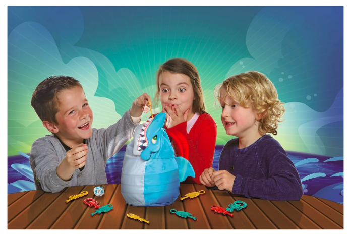 Snag the fish and be the winner, but if the shark jumps, you’ll be his dinner! Place the fun and colorful sea creatures into the game unit with a snap, and grab your friends to start playing. Players take turns rolling the die and fishing for the sea creatures using the fishing rods. But watch out – you never know when the shark is going to bite!