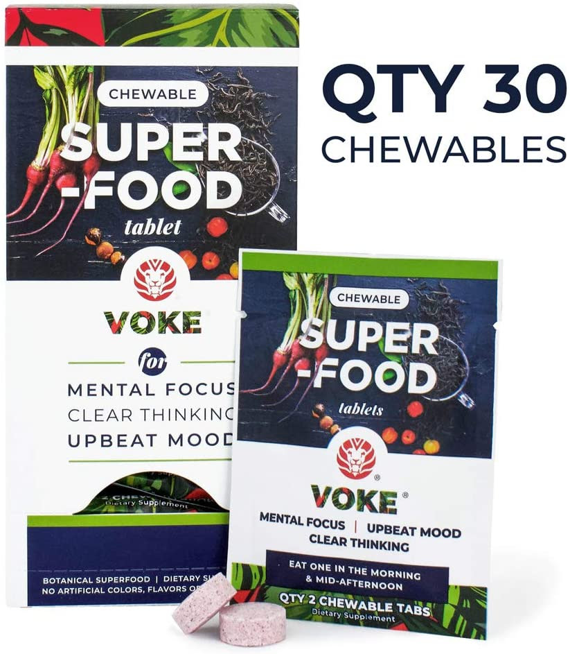 Voke gives your mind the gift of superfoods to clear brain fog and rapidly transforms your ability to focus on the task at hand. With ingredients backed by over 25 independent research studies, Voke will help you maintain all-day mental energy, laser focus, upbeat mood and clear thinking. Each chewable tablet will improve mental clarity, energy and focus for 3 hours. Due to Voke’s uniquely effective formula of superfoods, you won’t experience jitters or a crash.