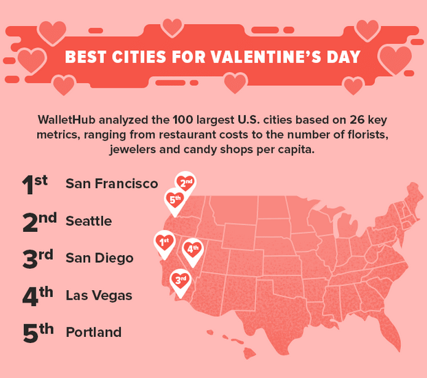 To determine the most romantic yet affordable cities for celebrating the Day of Hearts, WalletHub compared 100 of the largest U.S. cities across 26 key metrics, ranging from florists per capita to forecasted precipitation to the cost of a three-course meal for two.